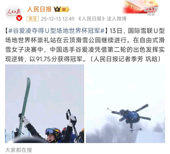 谷爱凌又玩了一把心跳!12月13日上昼,云顶滑雪公园,解放式滑雪U型步地寰宇杯崇礼站,她用试验行径告诉统统东谈主:冠军不是保来的,是拼来的。